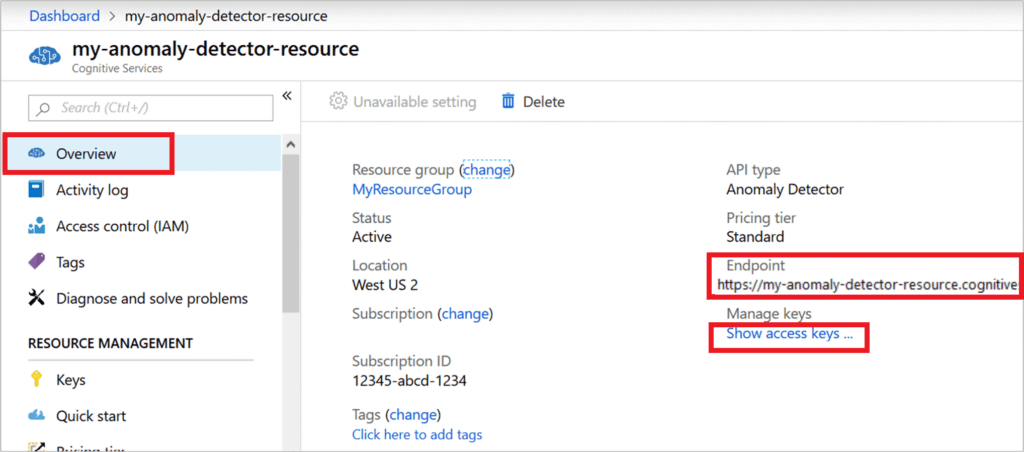 3 – Servisimiz oluştuğu zaman kaynağın genel görünüm sayfasından veya sol tarafta bulunan Keys sayfasından Endpoint ve Key’imizi alıyoruz ve uygulamamızı oluşturmaya hazırız.
