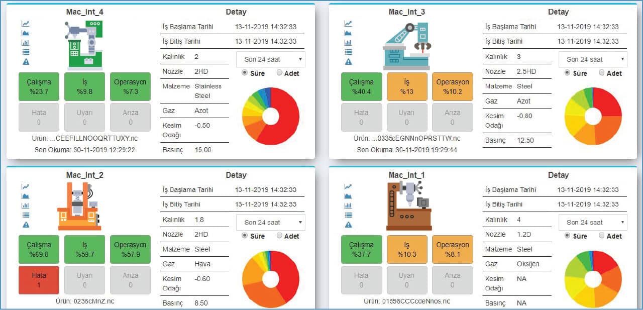 - Makine ve ekipmanların kolay ve sade web sayfaları üzerinden gerçek zamanlı olarak izlenebilmesini sağlar.