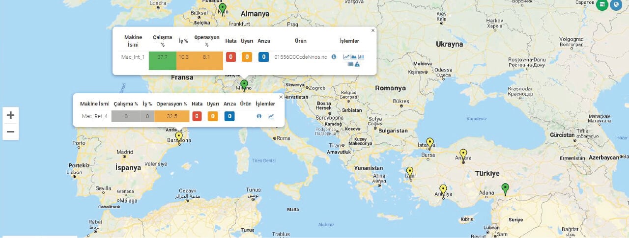 - Müşterilerine makine operasyon ve performans verilerini web ve mobil cihazlar üzerinden canlı olarak izleyebilmelerine olanak sağlar.
