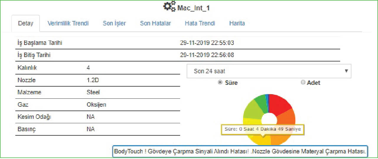 İşin başlama ve bitiş tarihi, son 24 saatte makineden alınan hatalar gibi makineye dair genel bilgiler gösterilir.