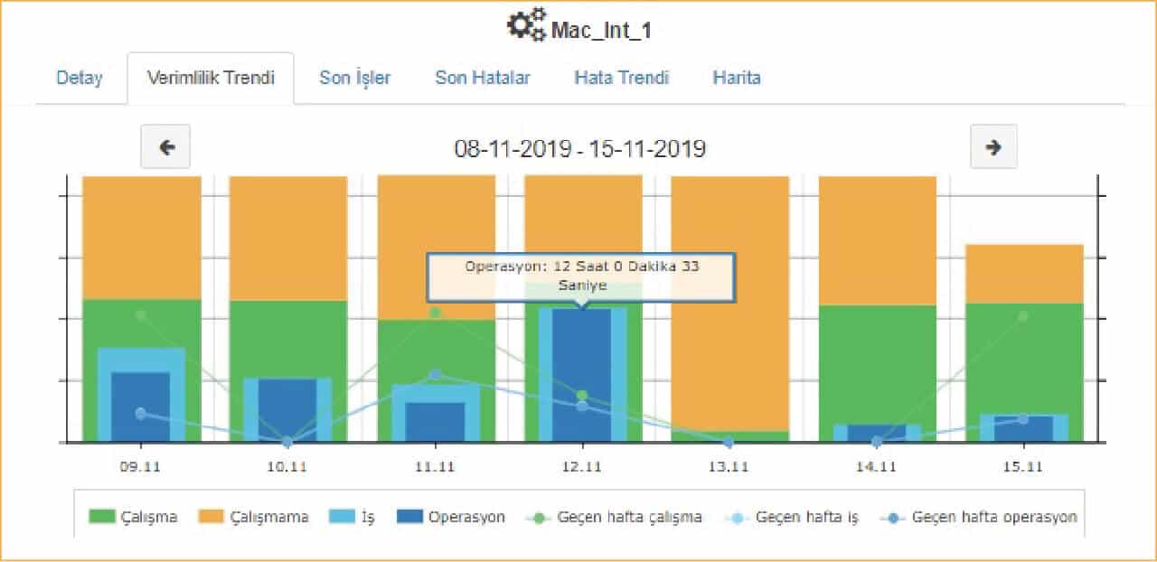 Makinenin son 7 günde, her bir gün için kaç saat kapalı kaldığı, kaç saat çalıştığı ve kaç saatini iş yaparak geçirdiği gösterilir.