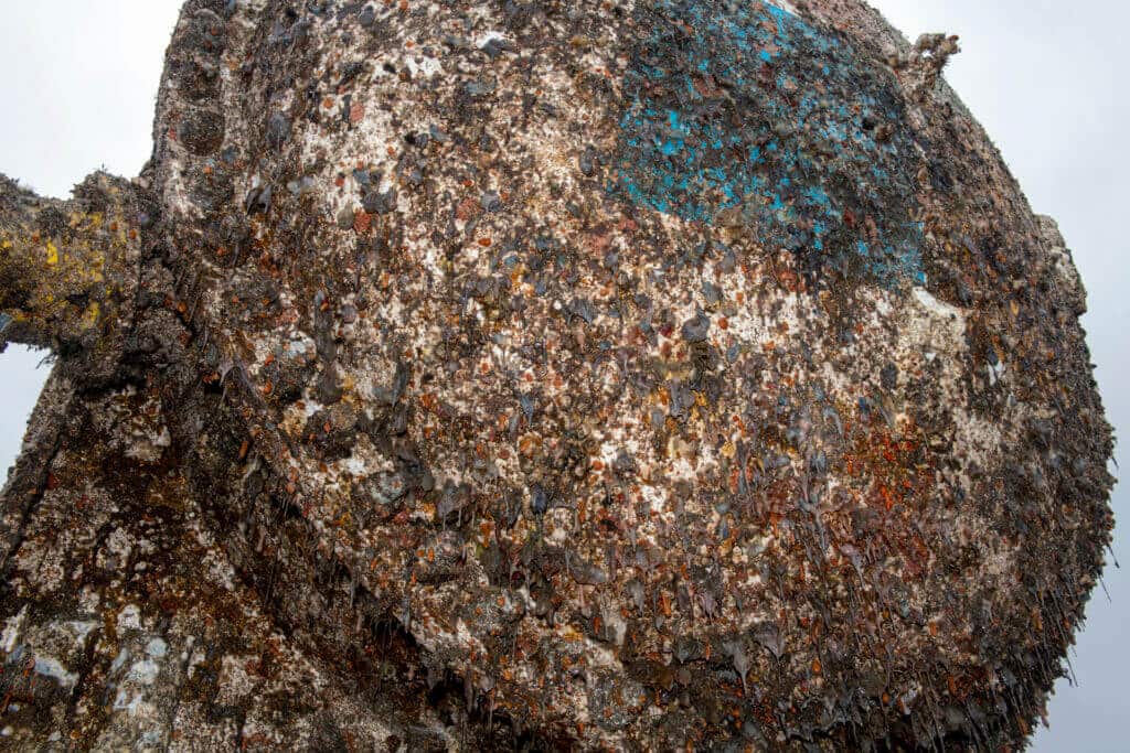 The Northern Isles was gleaming white when deployed. Two years underwater provided time for a thin coat of algae and barnacles to form, and for sea anemones to grow to cantaloupe size in the sheltered nooks of its ballast-filled base.